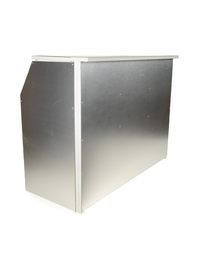Bar pliant simple et robuste. Ce bar dispose d’un cadre en acier époxy peint recouvert d’un laminé en aluminium. Plan comptoir et tablette intermédiaire. Bar modulaire avec des sections droites et des sections retour. Son épaisseur replié est de 18 cm !