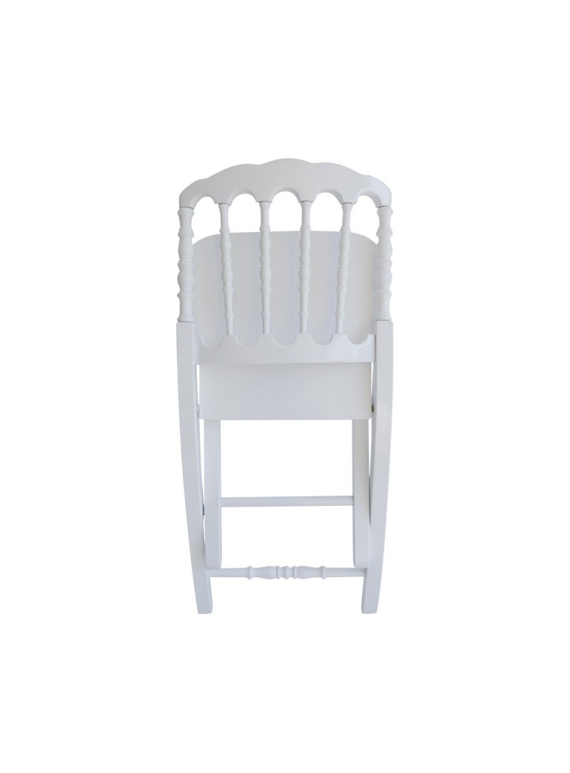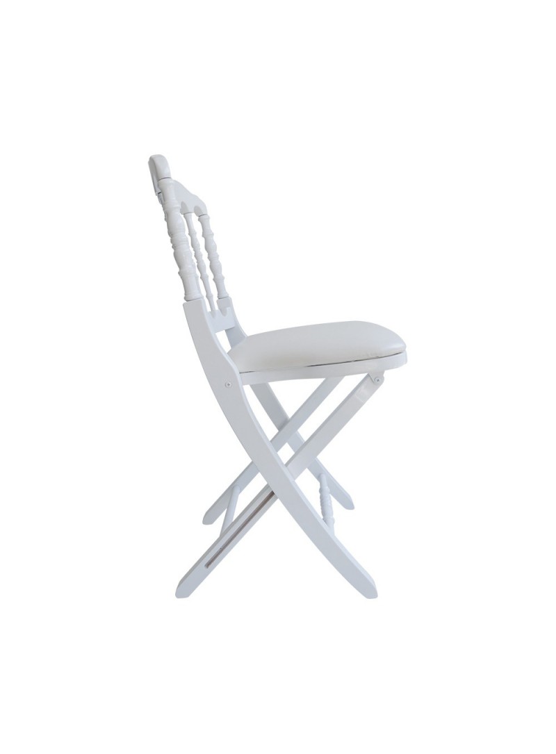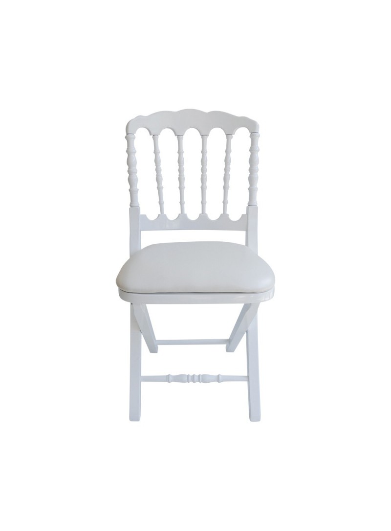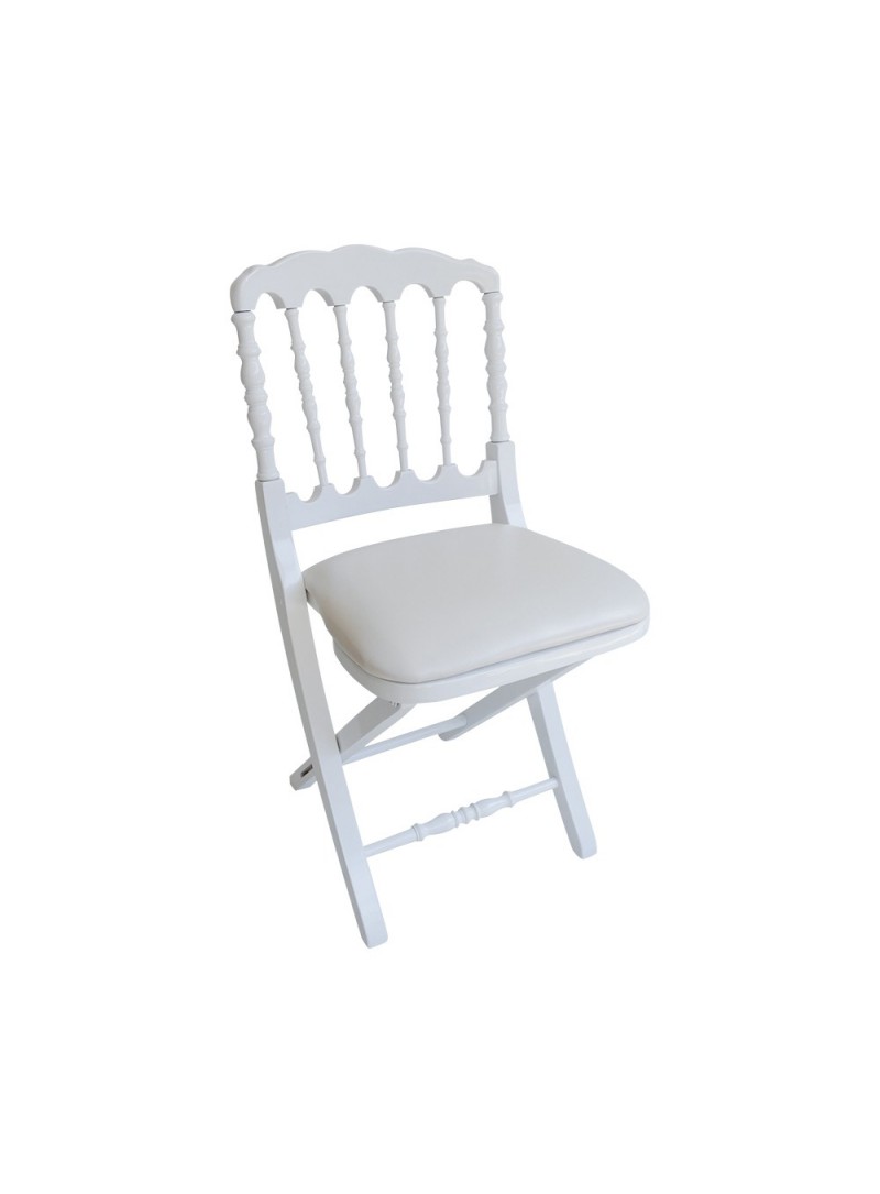 Chaise Napoléon III pliante pour les réceptions et les banquets. En bois laqué (hêtre), de couleur blanche, elle est proposée avec assise en vinyle blanc amovible.