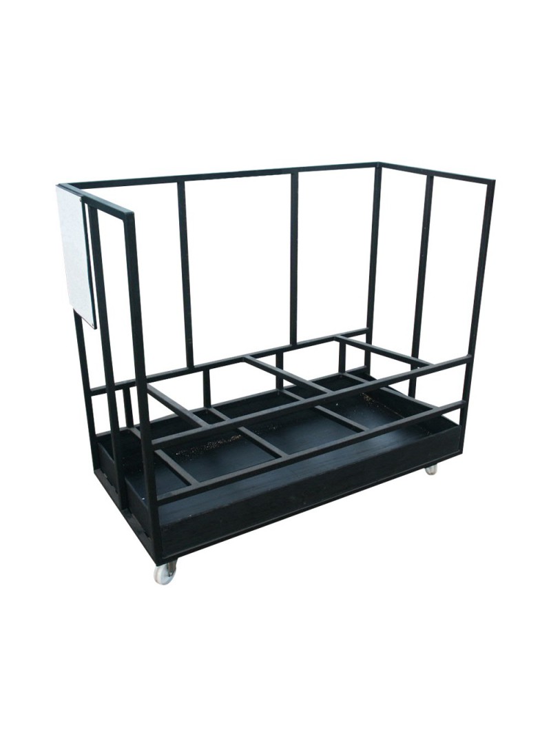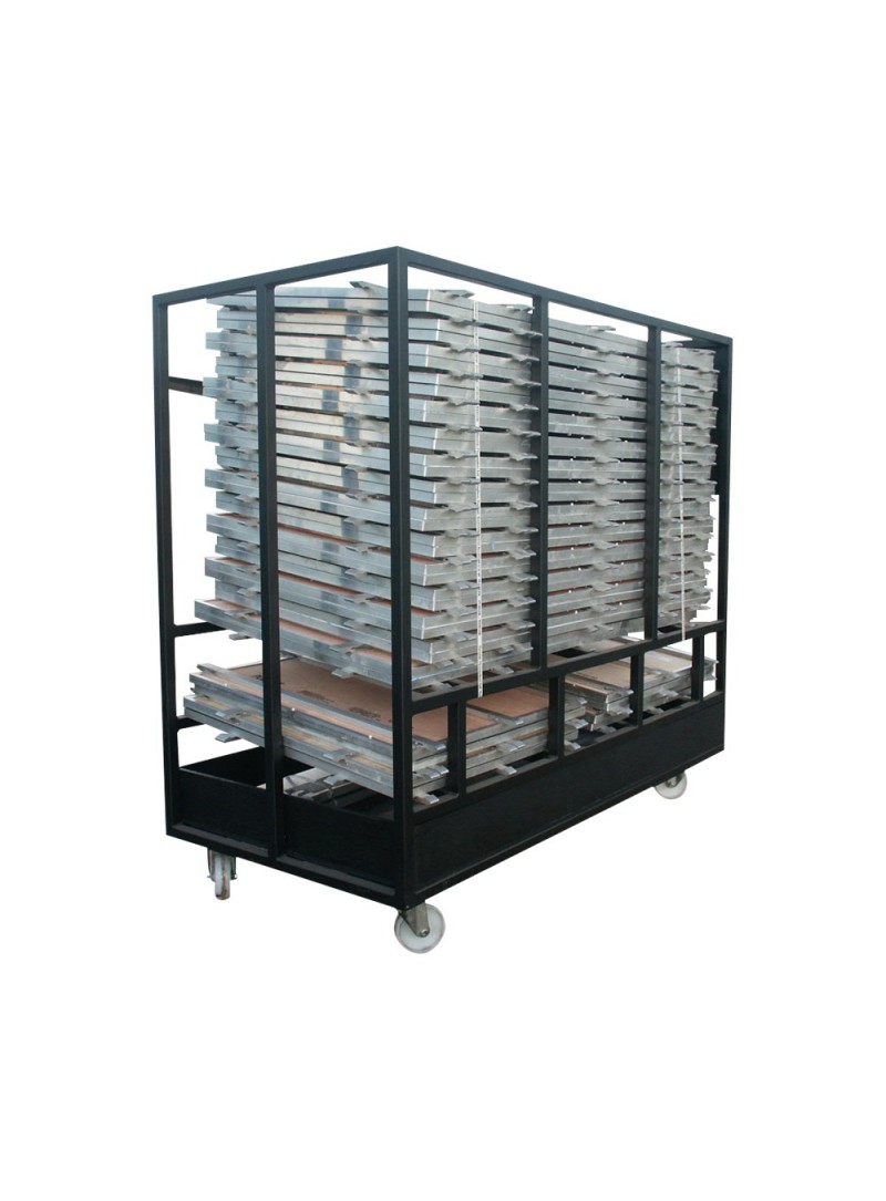 Chariot en acier et quatre grandes roues pivotantes, transport et stockage de pistes de danse en acrylique. Il permet de transporter des dalles rectangulaires rangées en position horizontale ainsi que les bordures.