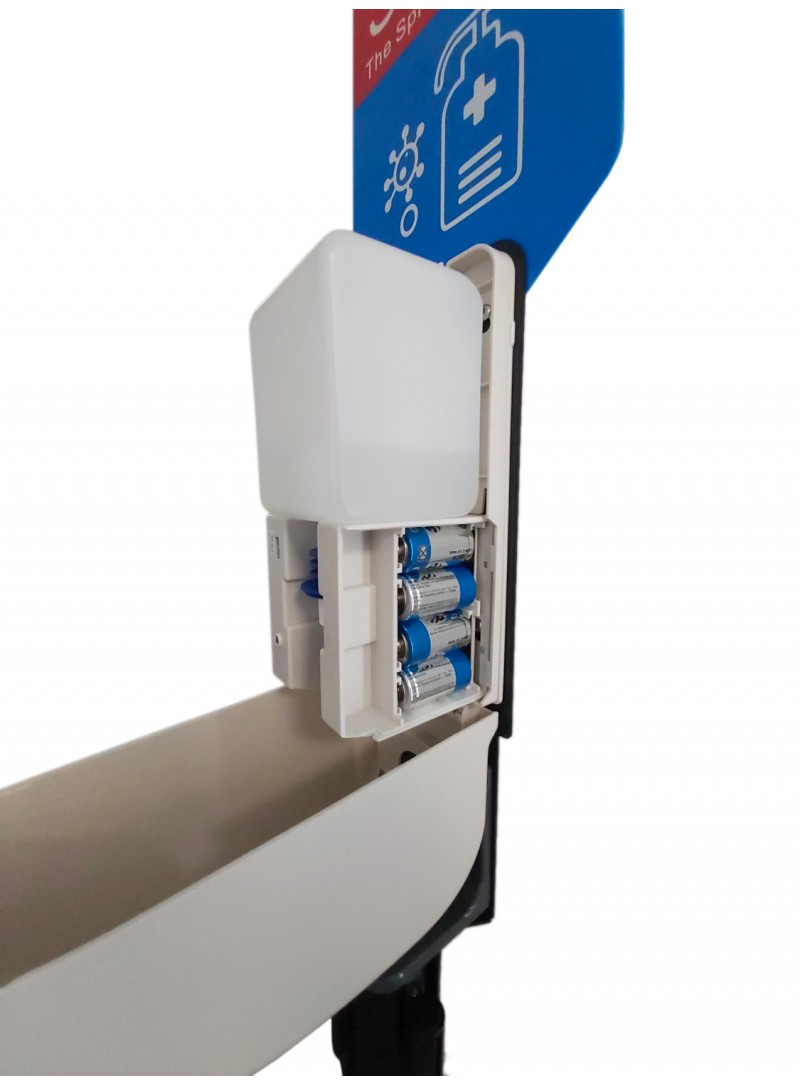 Support en ABS blanc comprenant le réservoir de gel en polyéthylène d’une contenance de 1 lt avec pompe et le compartiment à batterie ( 4 piles LR14 ), accessible uniquement lorsque le boitier est ouvert pour procéder au remplissage du réservoir.