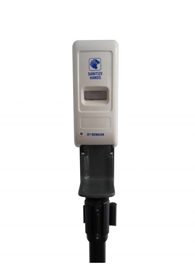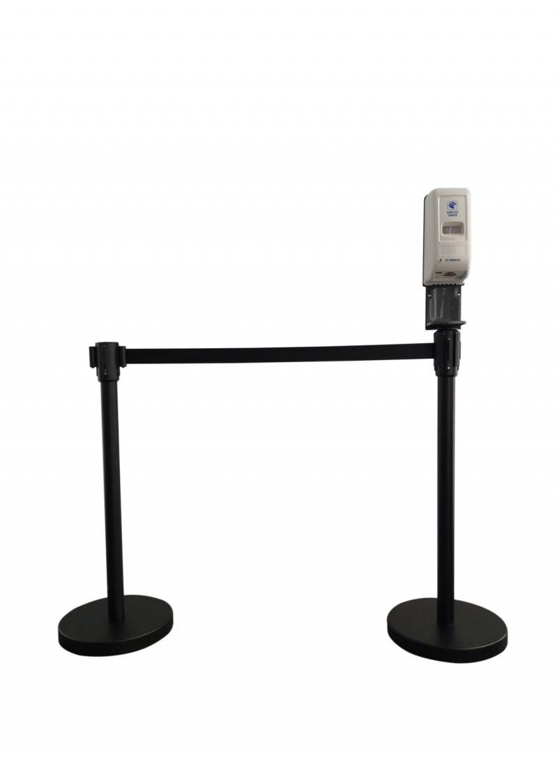 Distributeur Automatique de Gel Hydroalcoolique à clipser sur nos potelets à sangle.