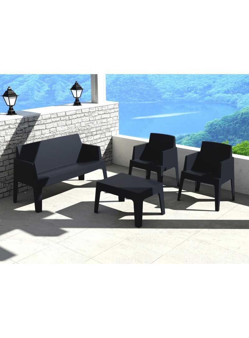 Ensemble composé d’un canapé, deux fauteuils et une table basse San Juan en polypropylène recyclé.
