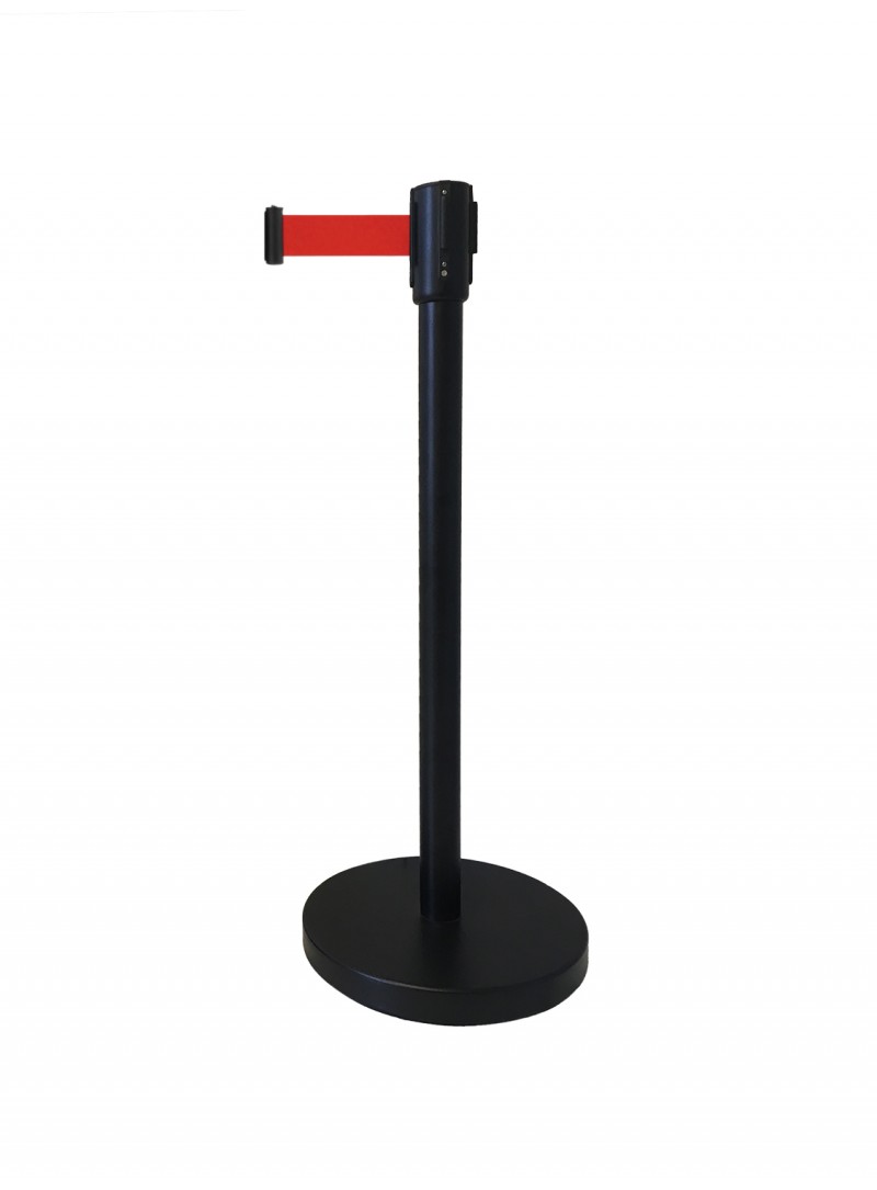 Potelet à sangle noir, rétractable reposant sur une base lestée à tête amovible par système de visse. Chaque tête de potelet est équipée d’une sangle rouge ou noir de deux mètres de longueur et de trois points d’accroche à 90°.