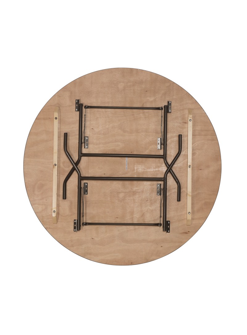 Table bois pliante ronde. Un plateau en contreplaqué de 18 mm recouvert de deux couches de vernis polyuréthane clair. Le «piétement américain» en acier est pliant. Resserré au plateau, il s’évase vers le sol, donne une meilleure stabilité et ne gêne pas les jambes des convives. Cette table est renforcée et s’empile aisément.